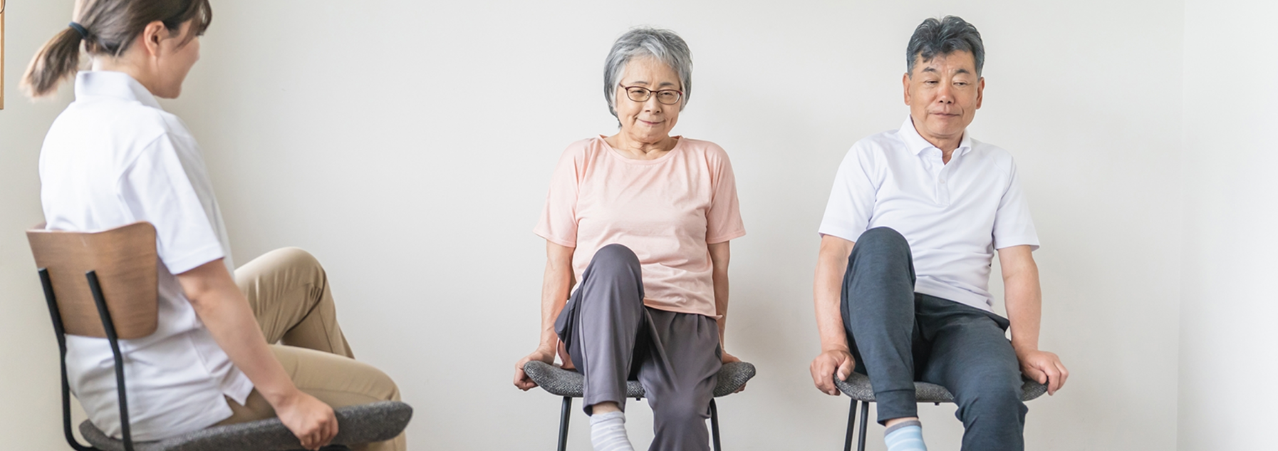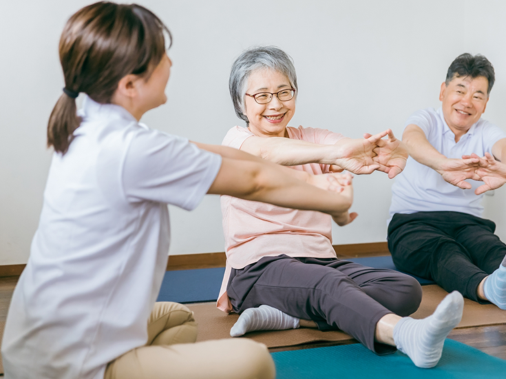 集団体操による身体機能の維持向上と、外出による社会参加を通じての心理・精神機能の安定と活性を図り、地域における自立した日常生活を営むことができるよう支援いたします。
