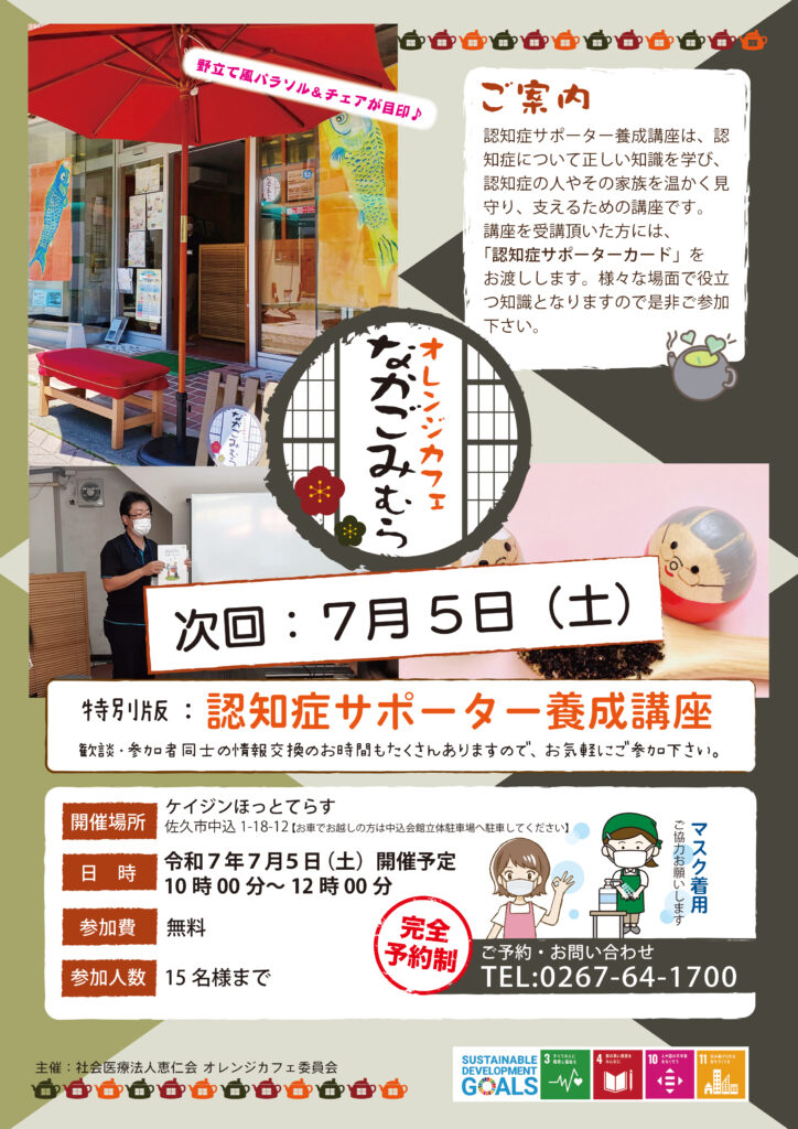 今回は7/5(土)開催の認知症サポーター養成講座のご案内です。