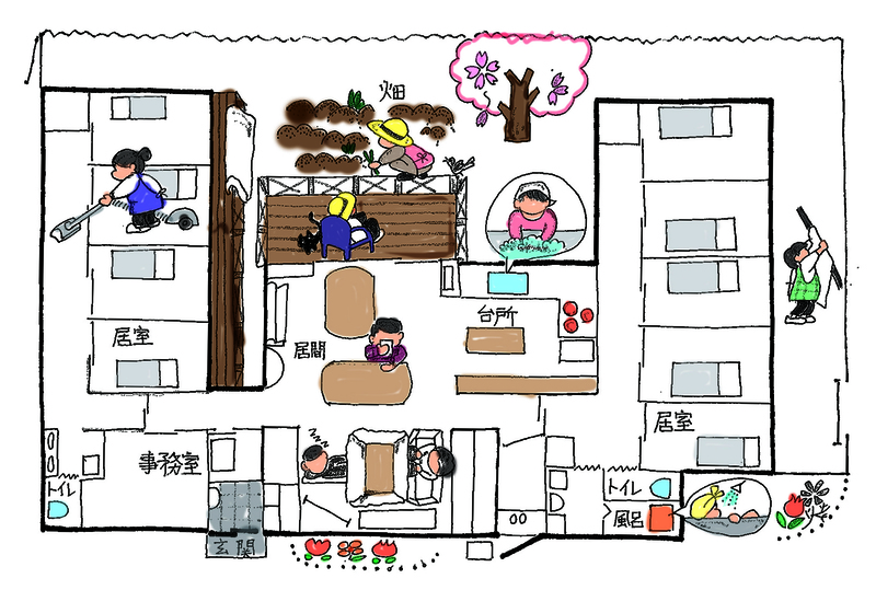 5~9人の少人数での共同生活を通じて、料理や掃除、洗濯などをスタッフや他のご利用者さまと協力して行い、また外出や畑仕事など地域との関わりをもって生活します。ケアの提供はご利用者さまの人格を尊重しながら行い、ご本人ができることの中から役割を見いだすことで、認知症の緩和や精神的に安定した生活を送っていただけるよう支援いたします。